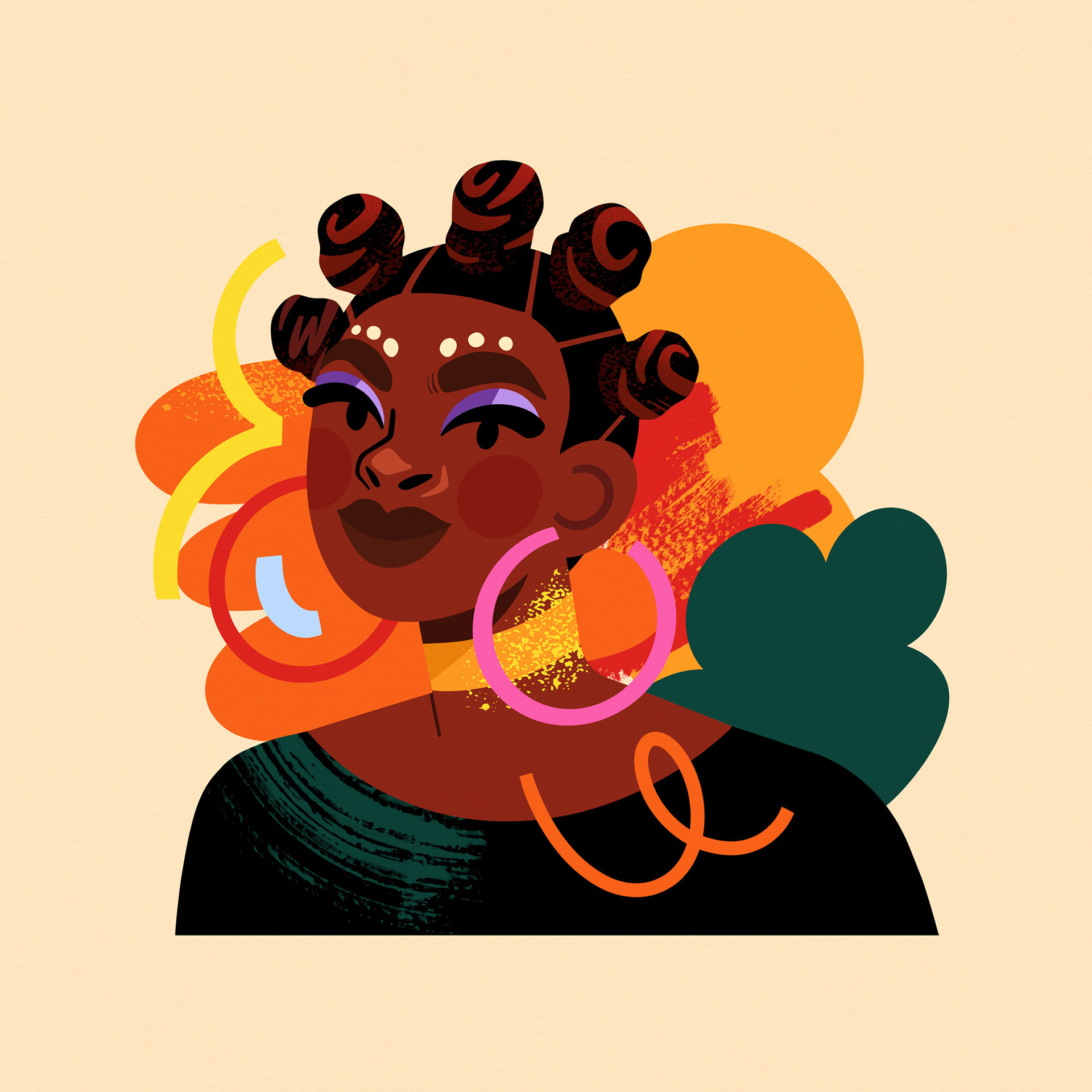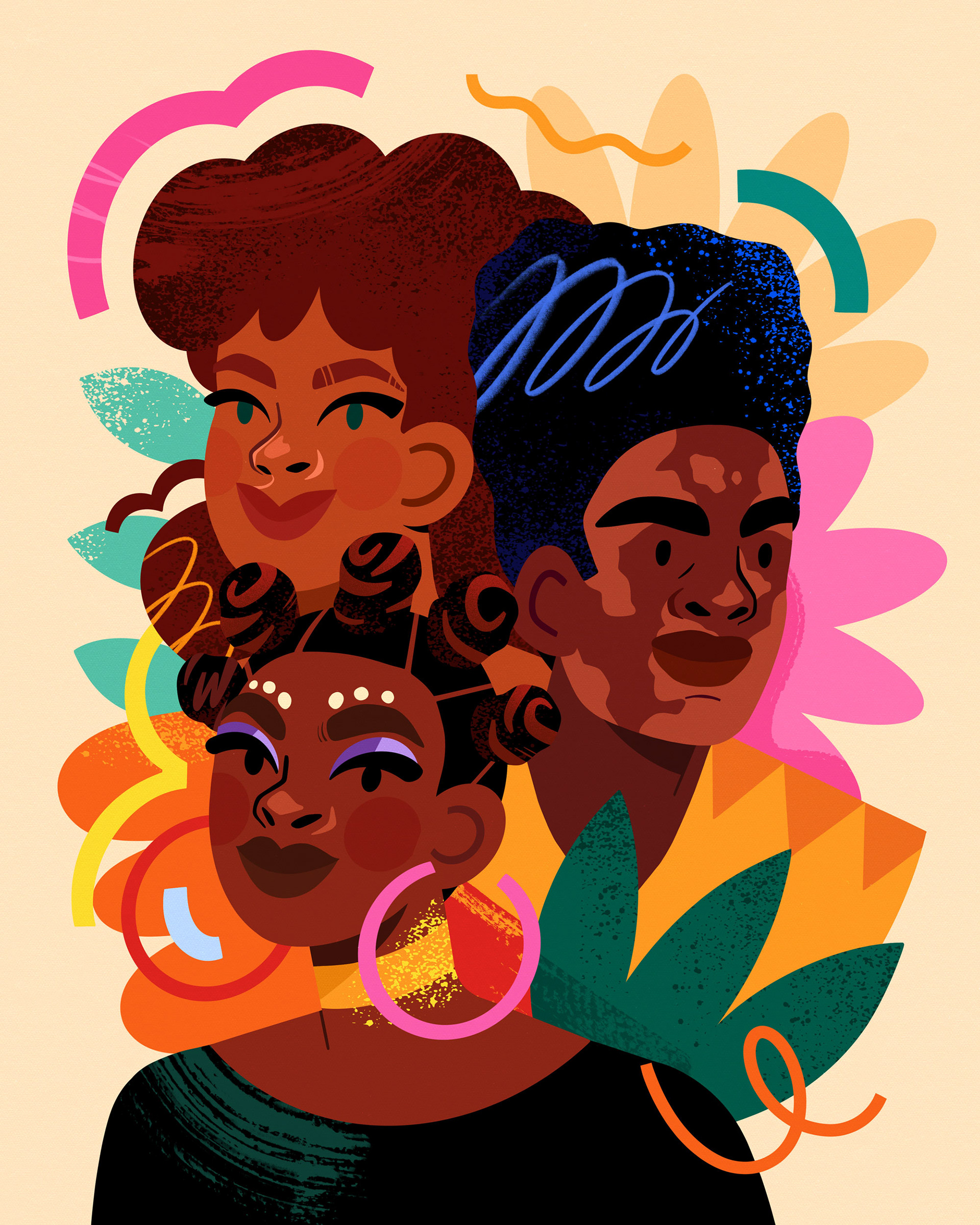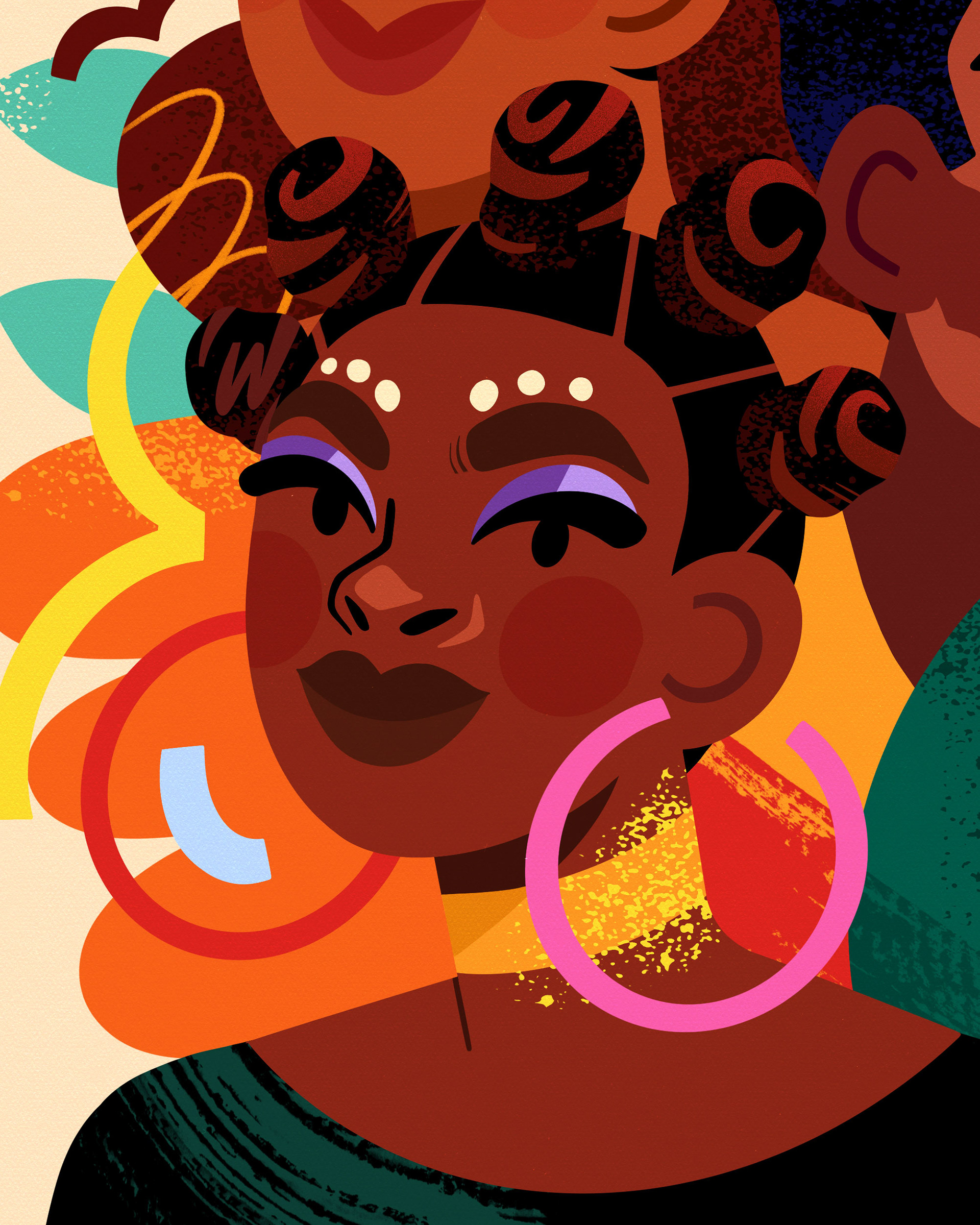 [PT-BR] Novembro é o Mês da Consciência Negra - período dedicado a celebrar e valorizar a história, a cultura e as contribuições da população negra no Brasil e em diferentes partes do mundo. Como artista negra e latino-americana, me inspirei na minha cidade, no bairro em que nasci e em minha herança ancestral para representar e enaltecer a beleza negra como protagonista dessa arte. Pude explorar diferentes estilos de cabelos, tons de pele e elementos gráficos nos diferentes personagens dessa composição, além de misturar texturas digitais e analógicas nesse projeto pessoal.