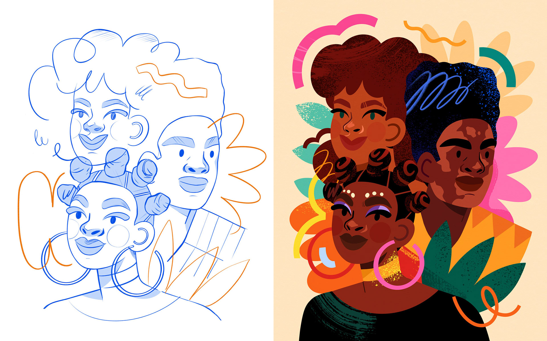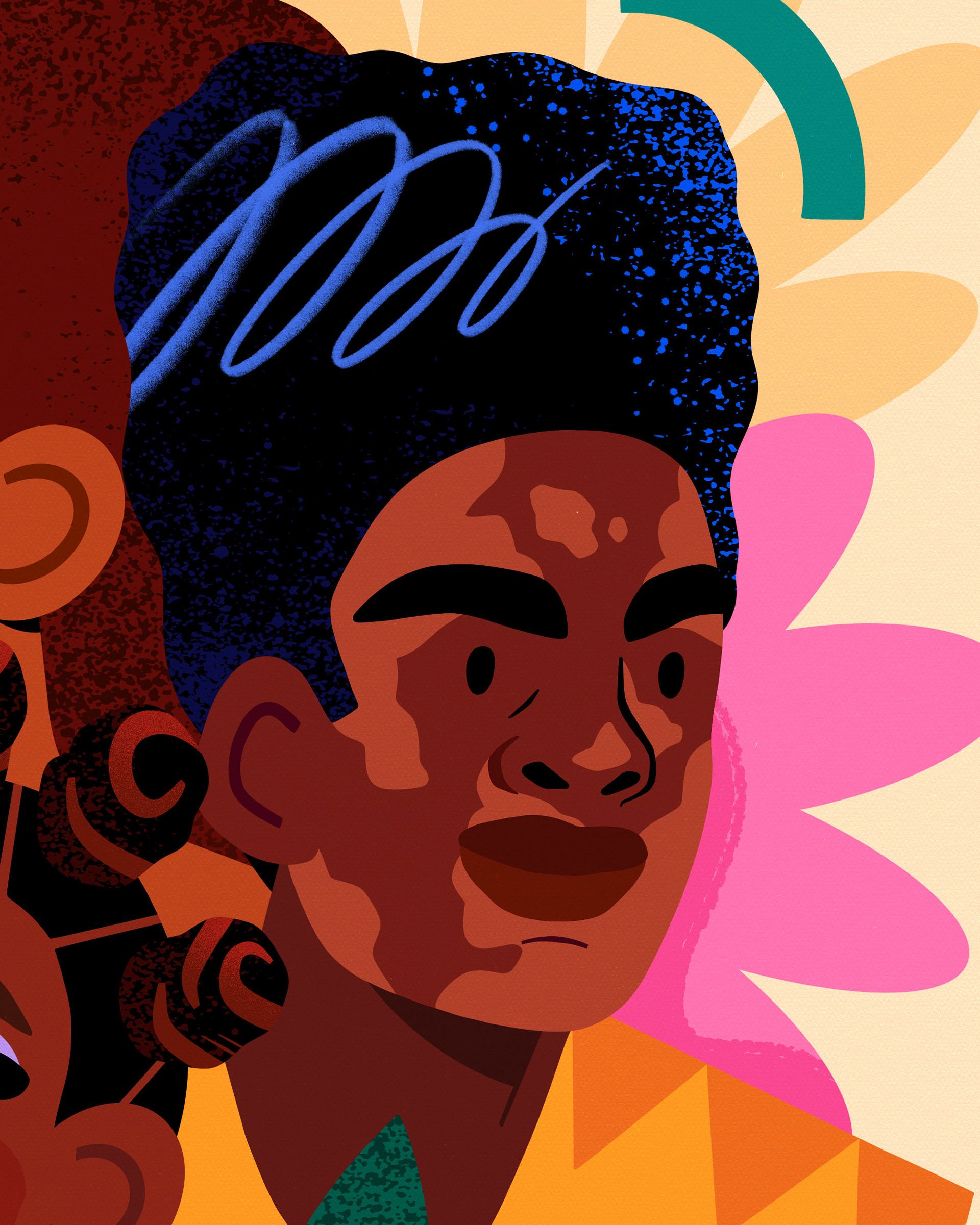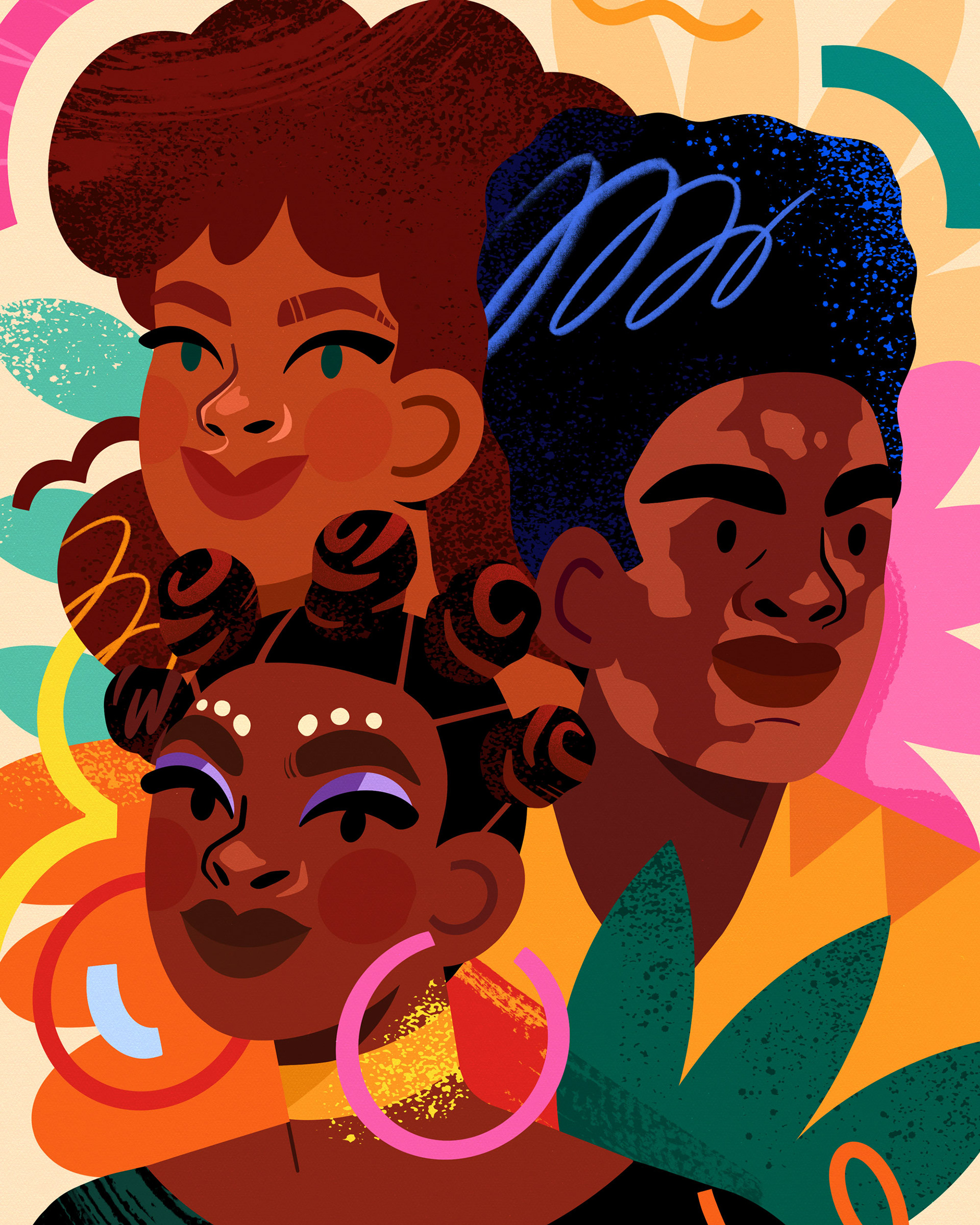 [PT-BR] Novembro é o Mês da Consciência Negra - período dedicado a celebrar e valorizar a história, a cultura e as contribuições da população negra no Brasil e em diferentes partes do mundo. Como artista negra e latino-americana, me inspirei na minha cidade, no bairro em que nasci e em minha herança ancestral para representar e enaltecer a beleza negra como protagonista dessa arte. Pude explorar diferentes estilos de cabelos, tons de pele e elementos gráficos nos diferentes personagens dessa composição, além de misturar texturas digitais e analógicas nesse projeto pessoal.