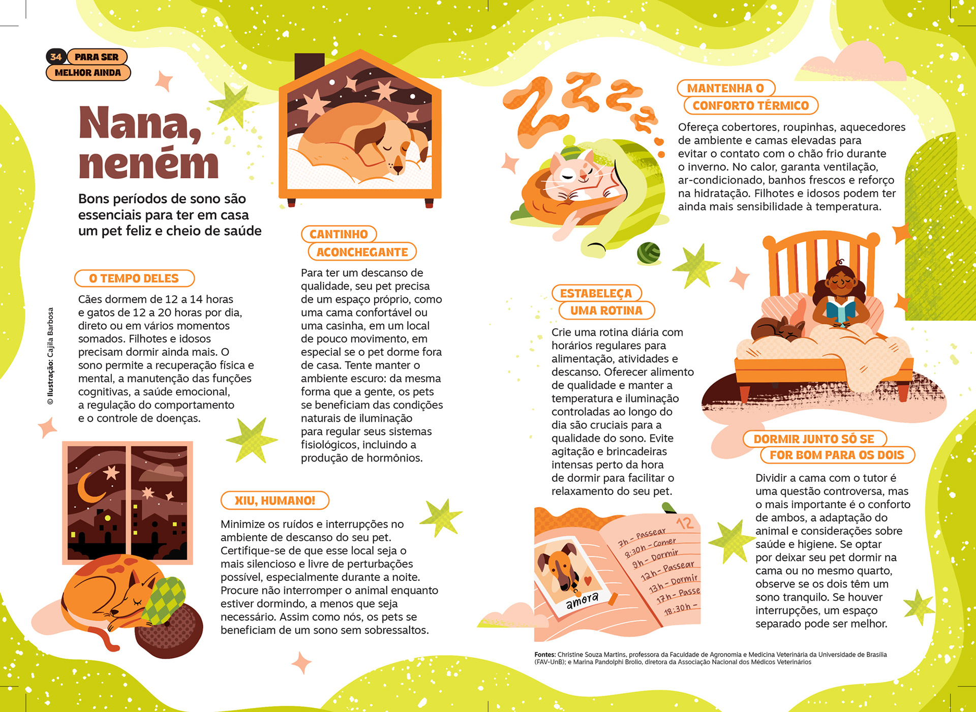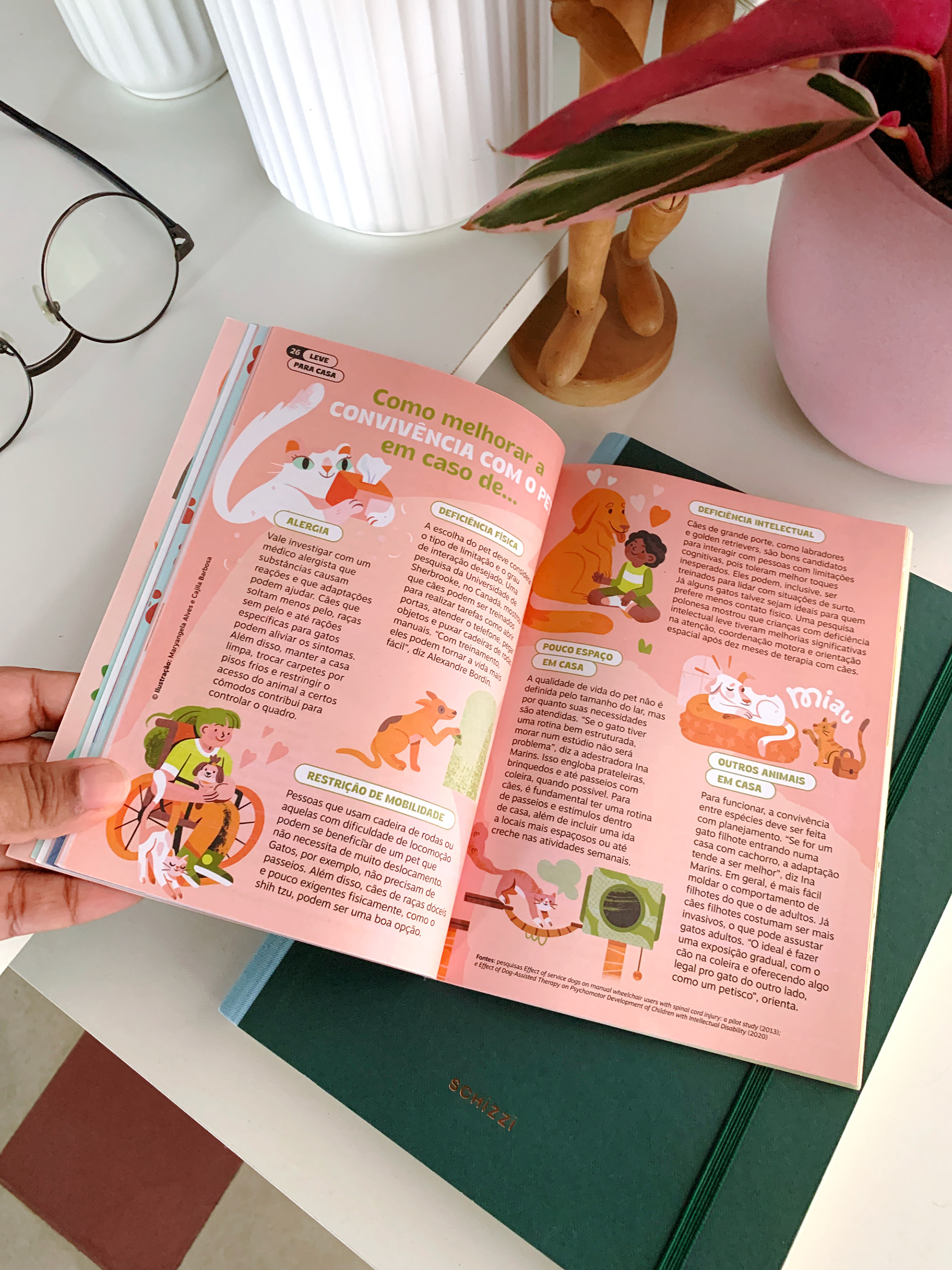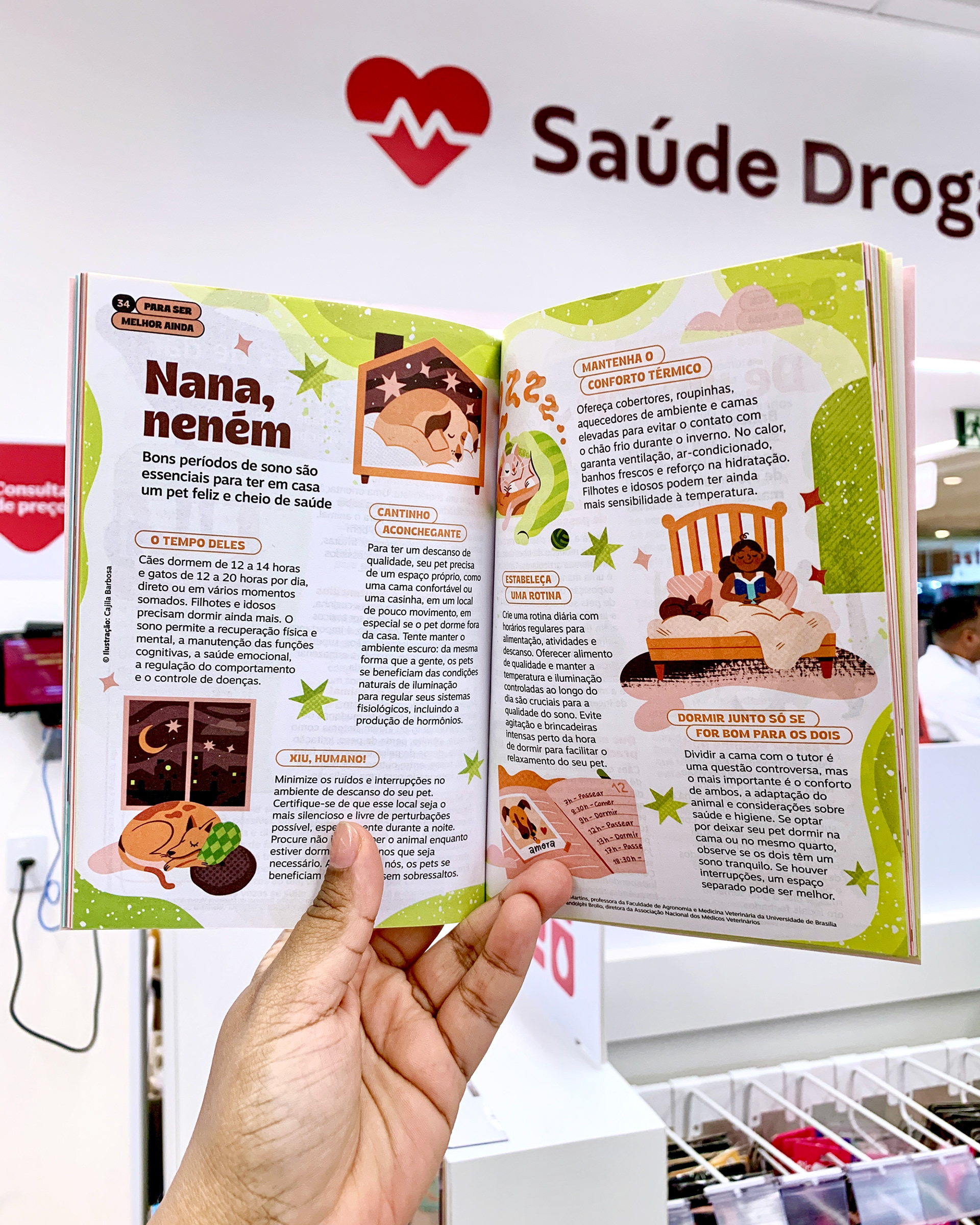 EN I was invited by MOL Impacto to collaborate as one of the guest artists illustrating the book Vitamina P (de Pets!) [Vitamin P (for Pets!)], created in partnership with Alexandre Rossi – Dr. Pet, a veterinarian specializing in animal behavior. I developed the illustrations for five double page spreads, complementing the informative content on topics such as care, affection, responsibility, and the relationship between people and their pets. The publication, in partnership with RD Saúde (Raia + Drogasil), one of the largest pharmaceutical networks in Brazil, is a social product that donates all profits from sales to more than twenty NGOs from all regions of the country, working for the universal right to health, education, well-being, animal protection, and environmental preservation.