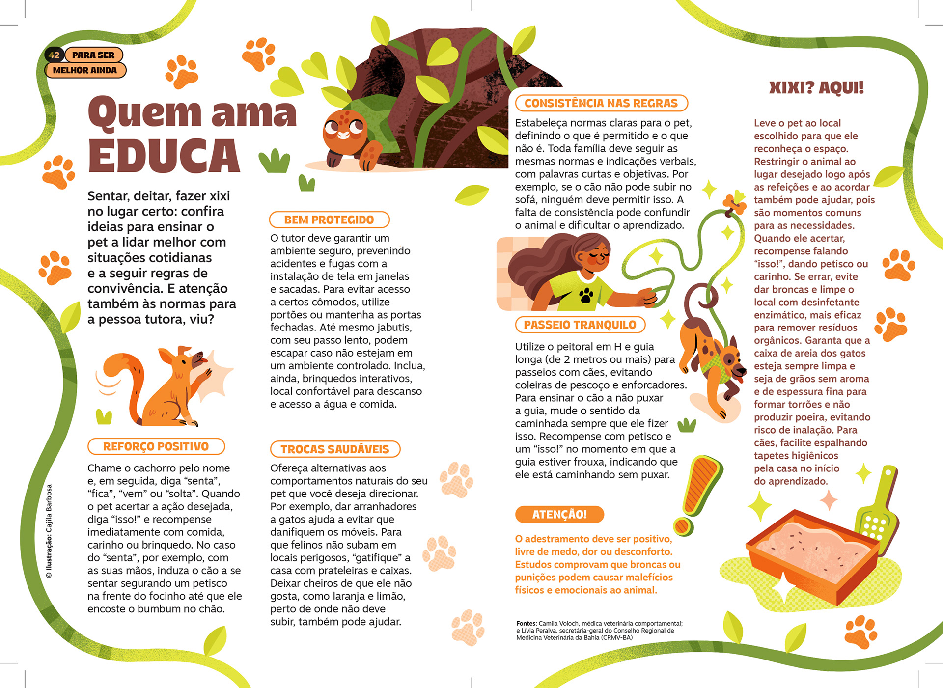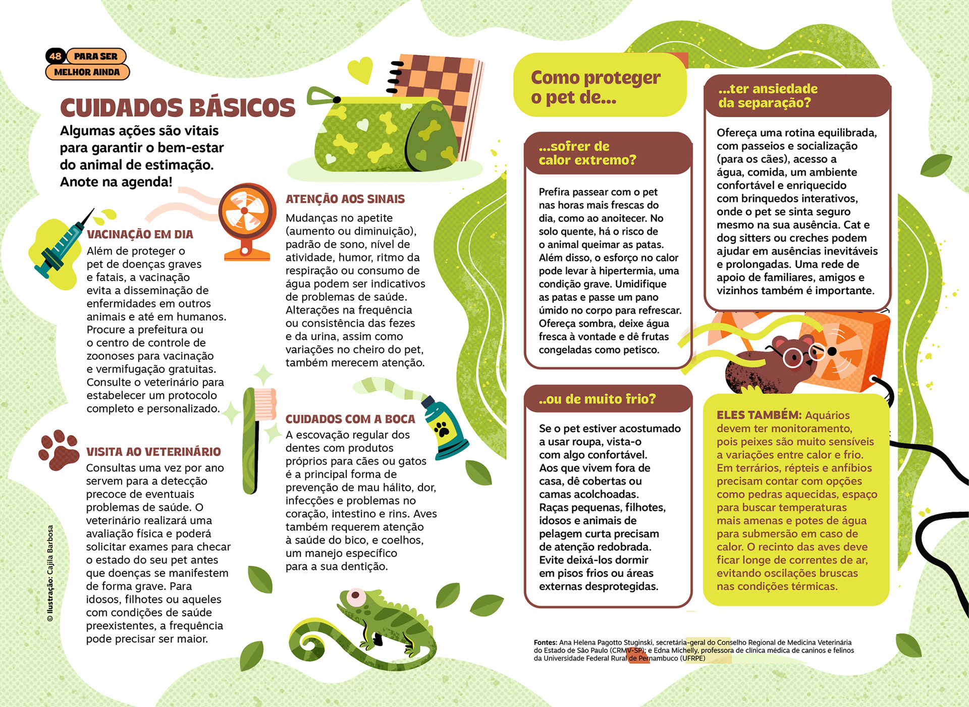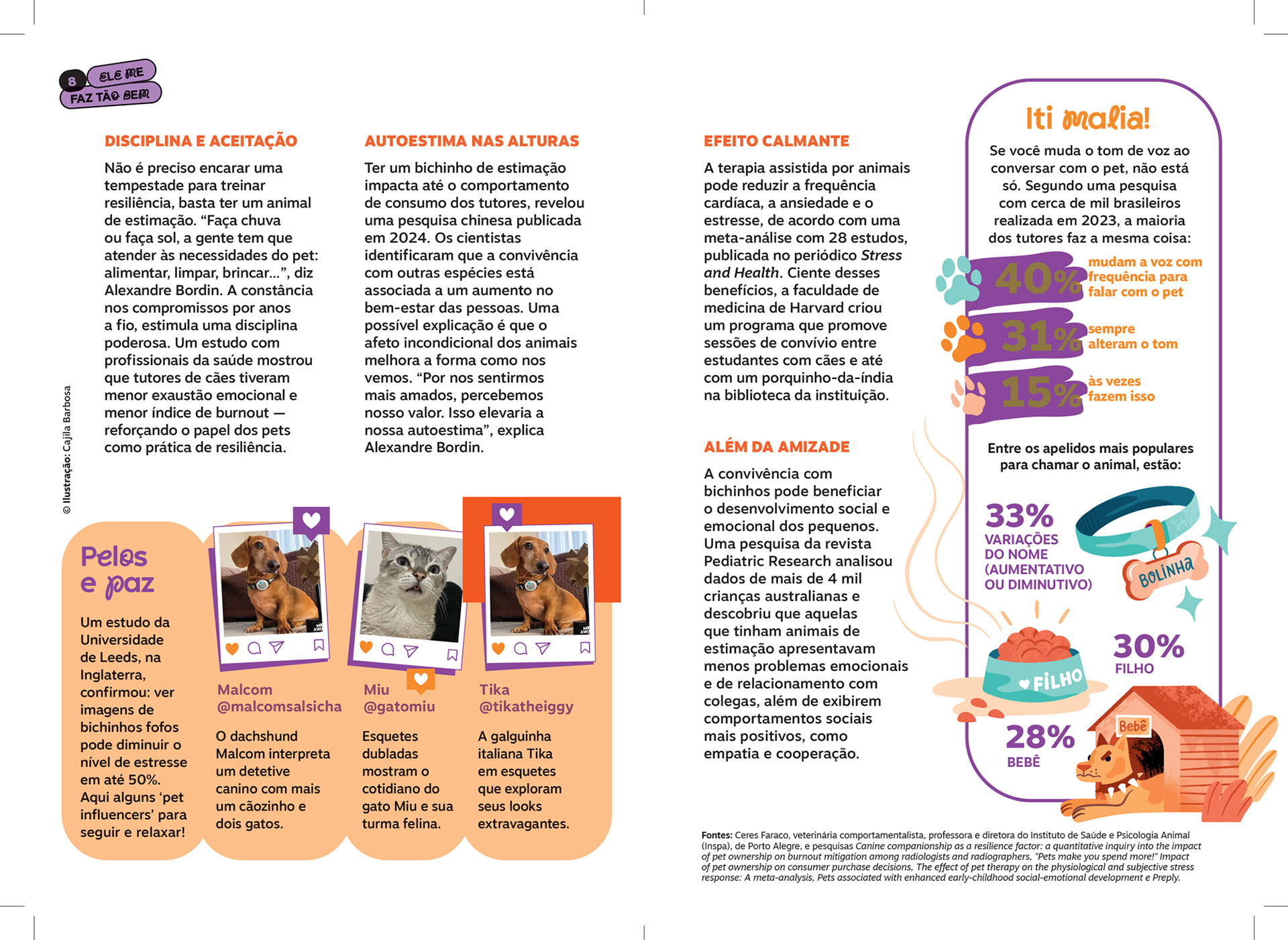 EN I was invited by MOL Impacto to collaborate as one of the guest artists illustrating the book Vitamina P (de Pets!) [Vitamin P (for Pets!)], created in partnership with Alexandre Rossi – Dr. Pet, a veterinarian specializing in animal behavior. I developed the illustrations for five double page spreads, complementing the informative content on topics such as care, affection, responsibility, and the relationship between people and their pets. The publication, in partnership with RD Saúde (Raia + Drogasil), one of the largest pharmaceutical networks in Brazil, is a social product that donates all profits from sales to more than twenty NGOs from all regions of the country, working for the universal right to health, education, well-being, animal protection, and environmental preservation.