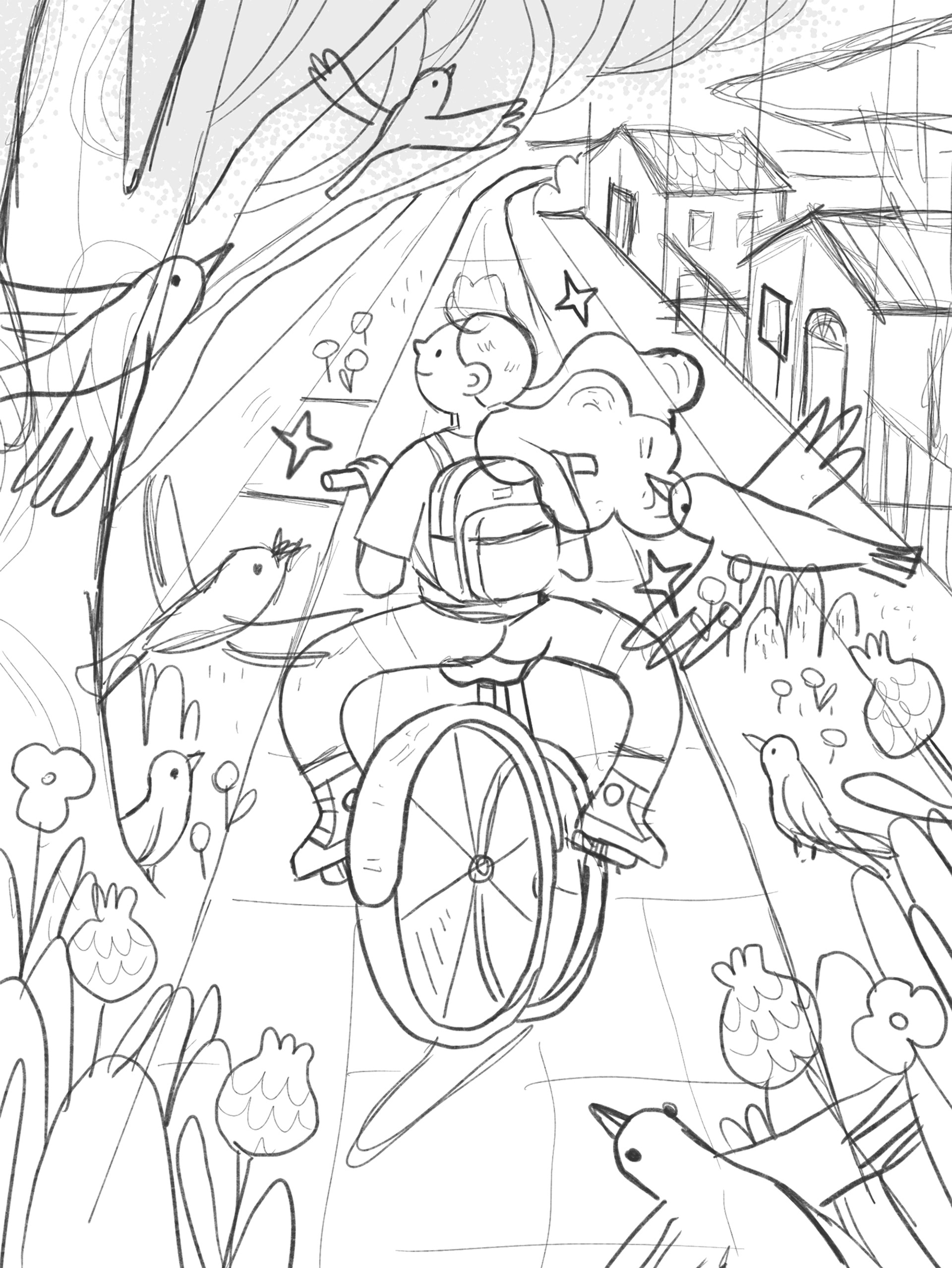 EN A simple bike ride on a vibrant spring day was the inspiration for this original illustration. The scene is a visual record of a very special memory I experienced while cycling through the streets of Curitiba, Brazil, the city where I lived for almost a decade. On that perfect day, I appreciated the beauty of the city while listening to my favorite playlist and watching the birds crossing the sky, as if accompanying the gentle rhythm of the journey. The image is born in that brief moment of freedom, like a fragment of time in which landscape, movement, and memory connect with each other.