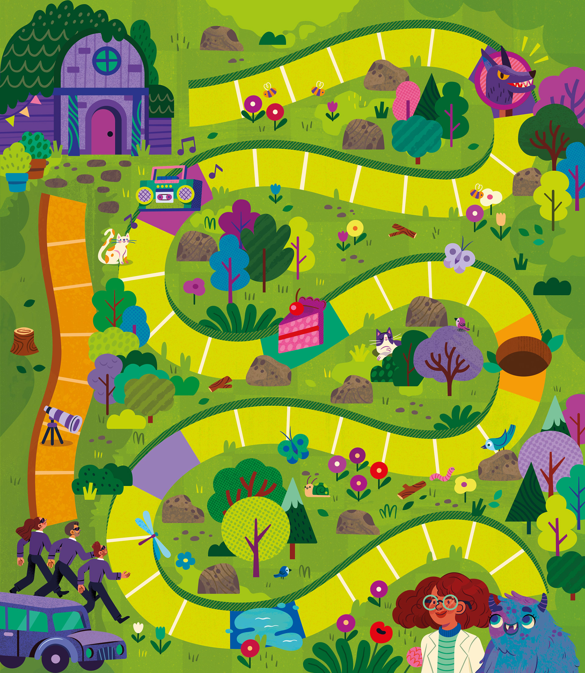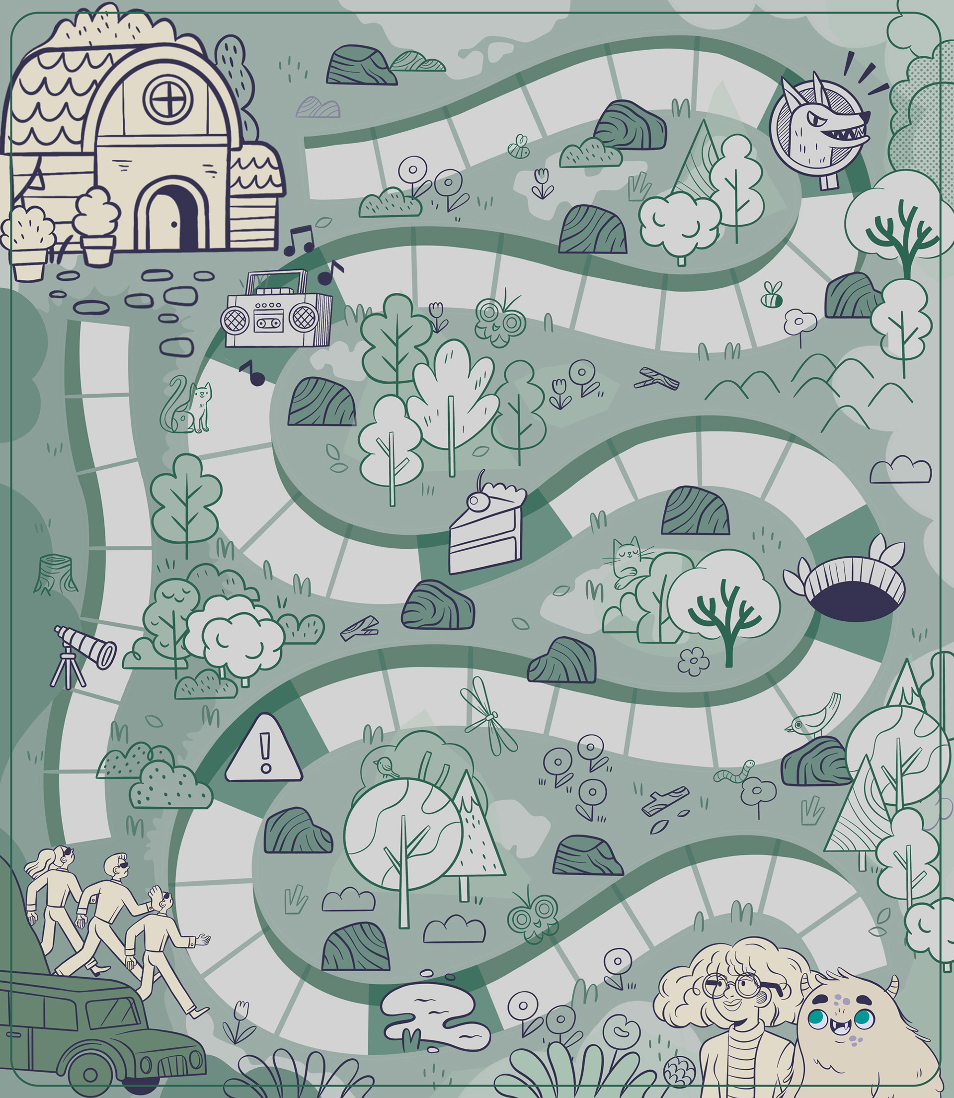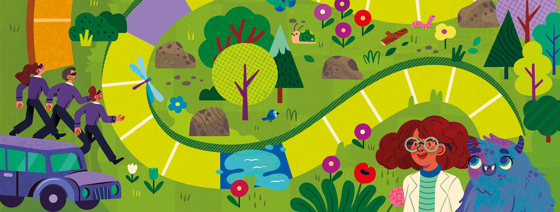 EN I was invited by Toyster to create the original illustrations for the "Ser Social (Be Social) game, an educational board game for children aged 6+. The challenge of the game is to help the scientist Sofia and the little monster Lup get home by navigating the spaces on the board along a specific path, before evil researchers catch them. This fun journey encourages children to develop their social skills and learn through play. In this project, I developed the artwork for the board, the character designs (scientist, little monster, and villains), the roulette wheel, and the reward tokens, following the briefing provided by the Toyster team.
